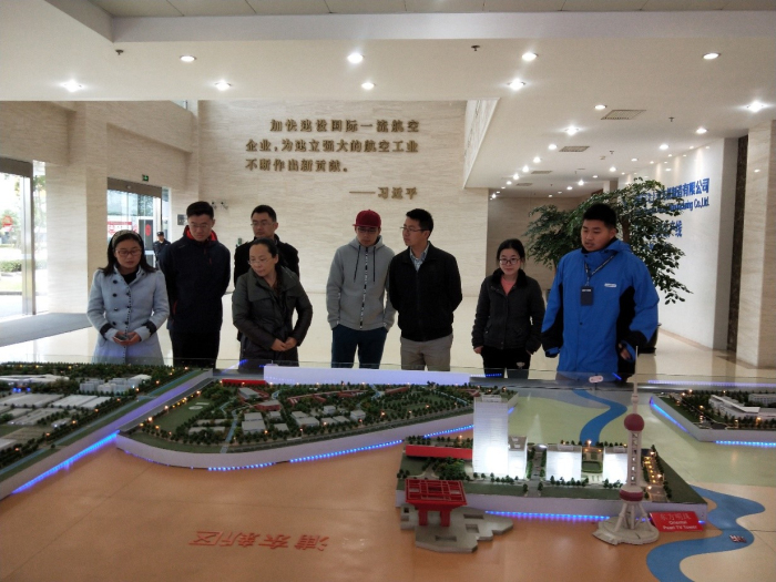 进入C919总装中心一楼大厅,同志们首先看到是习近平总书记视察商飞公司时的题词:“加快建设国际一流的航空企业,为建立强大的航空工业不断做出新贡献。”然后,同志们共同参观了商飞“一个总部、六大中心”的整体布局沙盘,并听取了工作人员对中国商飞整体布局的细致讲解,了解到中国商用飞机有限责任公司(简称“中国商飞”)成立于2008年,总部设在上海,是我国实施国家大型飞机重大专项中大型客机项目的主体,设计研发中心承担了我国首次自主研制的C919大型客机、ARJ21新支线飞机的工程设计任务和技术抓总责任。C919为国产中短程干线客机。总长38米,翼展33米,高12米,基本型布局168座,标准航程4075公里,增大航程5555公里,经济寿命9万飞行小时,与空客A320、波音737属同级别飞机。C,是china的首字母,“9”的寓意是天长地久,“19”代表客机最大载客量为190座。