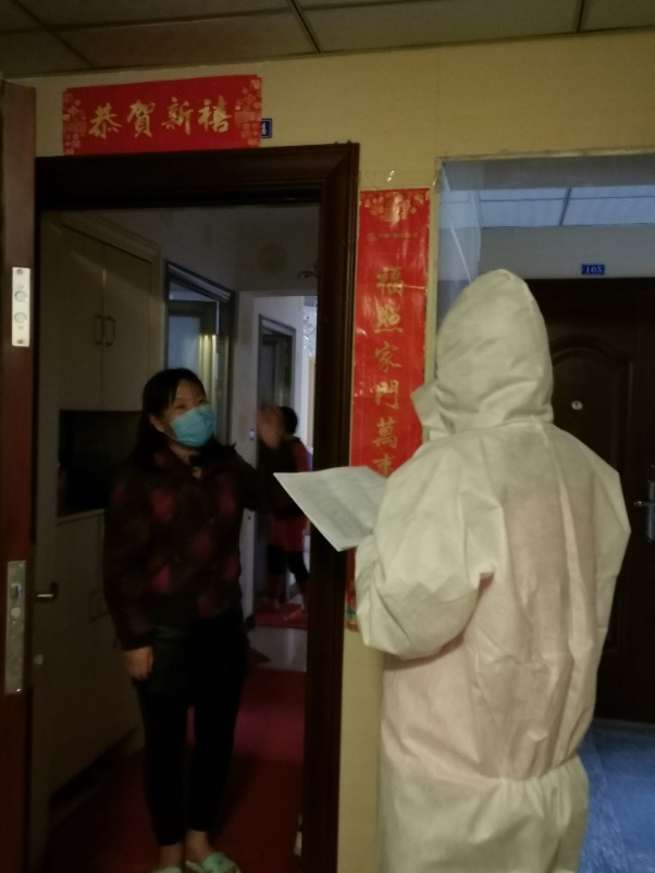 我最开始的任务是整理所有支部志愿者的名单,组织每天小区各个出入口的在岗排班和查岗工作。不仅如此,我还参与到了站岗的队伍当中,负责小区一号岗进出人员的排查工作。在2月21日,服从组织安排,我被调到了温控小组,负责协调组员收集各户人员的家庭和身体状况信息。2月22日我们还组织了一次小区住户上门整体摸排和生活物资发放行动,一共摸排统计了我们小组负责的18-21号楼所有在家的434户共1464人的情况。这其中还包括因新冠病毒肺炎确诊而封闭的19号楼中的377人。此后我们每天要更新所辖住户的家庭和身体信息,组员门负责自己分派的住户,我负责整理统合这些信息并上报。