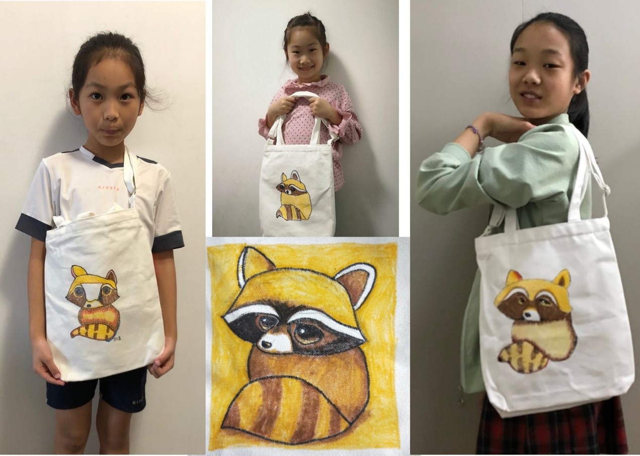 王老师一边画一边耐心地给小朋友讲述绘画要点,首先准备好专用的布艺绘画笔,然后用细细的黑色勾线笔先后勾勒出图案的外部和内部轮廓,最后细致、均匀地涂色。孩子们一边专心听讲,一边认真实践。