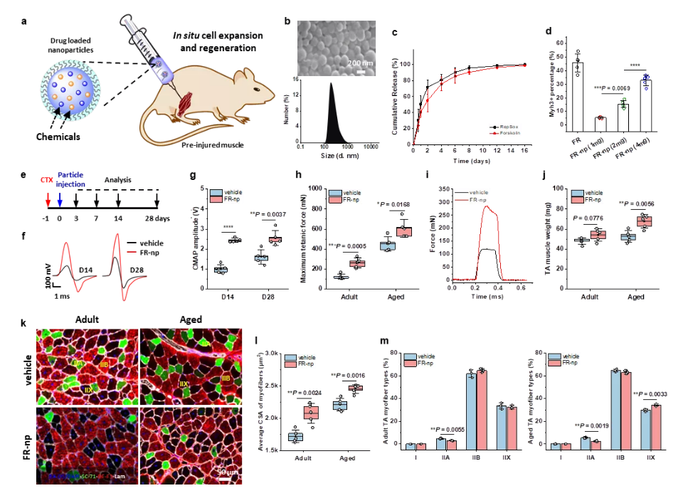 图3. 载小分子药物纳米颗粒促进肌肉修复再生