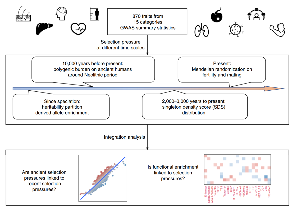 林关宁团队利用870个多基因性状的全基因组关联研究(GWAS)的数据,使用了多种计算模型对它们随时间的选择压力进行了全面分析,定量分析了这些表型在四个时间尺度(当代、最近三千年、新石器时代、现代智人形成以来)所受的自然选择压力的大小、形式及方向。