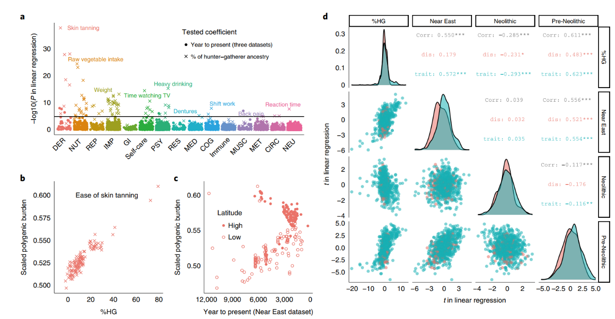 团队研究显示,大量的人类表型在近代都出现了显著的适应性变化,其中尤以体型、肤色、营养及代谢等表型为主。而控制大脑相关表型的位点在最近数千年则表现出较少的适应性变化,且往往分布在漫长进化史中较为保守的、受较强负性选择的的基因组区域内。当将各个时间点的结果综合起来,团队发现同一个表型受到的选择压力在不同时间具有一定的一致性;同一个表型在不同时间受到相反的选择压力是比较少见的。本研究还发现了数个似乎能影响人类生育能力和交配成功的人类表型,甚至还有一些不符合直观的自然选择现象下的表型,例如高智商的个体在当代倾向于有更少的后代进而导致对智商造成负向选择、有精神分裂症和注意缺陷与多动障碍等高风险男性但未患病者的性伴侣数量会增多、与饮酒相关的表型在酿酒技术尚不成熟的前新石器时代就已出现了适应性变化等。总的来讲,本研究证实了尽管人类社会环境不断发生变化,人类遗传表型仍然在持续地受到自然选择的塑造作用。