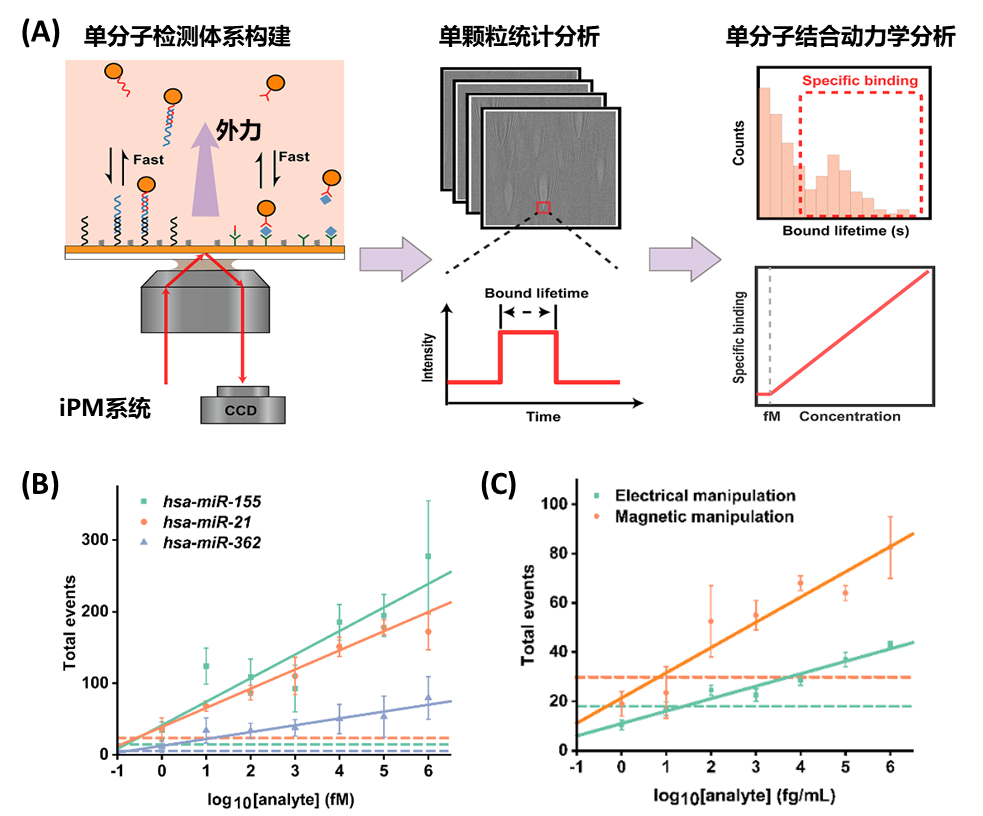 单分子动态传感技术检测microRNA和蛋白分子。(A)单分子动态传感技术示意图:采用纳米粒子和SPRI系统构建单分子检测体系,并施加外力调控分子结合动力学;通过对纳米粒子的统计分析获得单分子结合动力学信息,排除非特异性结合来获得亚fM级检测限;(B)通过施加电场力调控,检测三种疾病相关的microRNA分子;(C)通过电场力或磁场力调控,在血清中检测Aβ1-42分子浓度,检测限达fg/mL级。