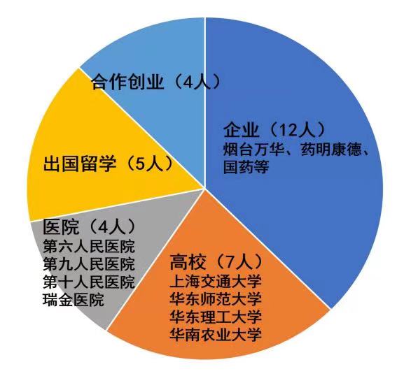 主要去向主要包括:1)合作创业,负责将原创研究实施临床转化;2)科研(国内外高校,医院);3)企业(如:烟台万华、国药、药明康德等)