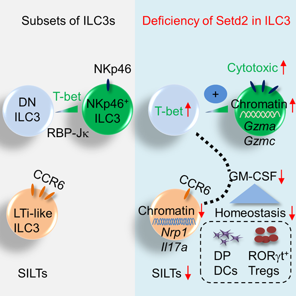 研究人员首先利用组织特异性Setd2基因敲除小鼠模型发现,Setd2的缺失会导致总ILC3细胞自身丰度减少,同时NKp46+ILC3亚群会呈现比例增加且高表达细胞毒性相关分子。而CCR6+ILC3亚群呈现细胞数减少和功能下降,同时伴随肠道孤立肠淋巴组织形成缺陷。适应性免疫系统重建实验发现在ILC3中特异性缺失Setd2的Rag1-/-小鼠易感于肠道炎症并伴随RORγt+Treg的稳态维持缺陷。这可能是由于Setd2缺陷的NKp46-ILC3分泌GM-CSF降低,继而导致CD11b+CD103+树突状细胞减少导致的。研究人员进一步通过ATAC-seq的手段发现Setd2可通过影响ILC3亚群的染色质可及性从而调控基因表达。这些结果证实,在肠道免疫中,Setd2可以维持小鼠肠道ILC3的自稳态并对ILC3的亚群分布和功能有重要调控作用。