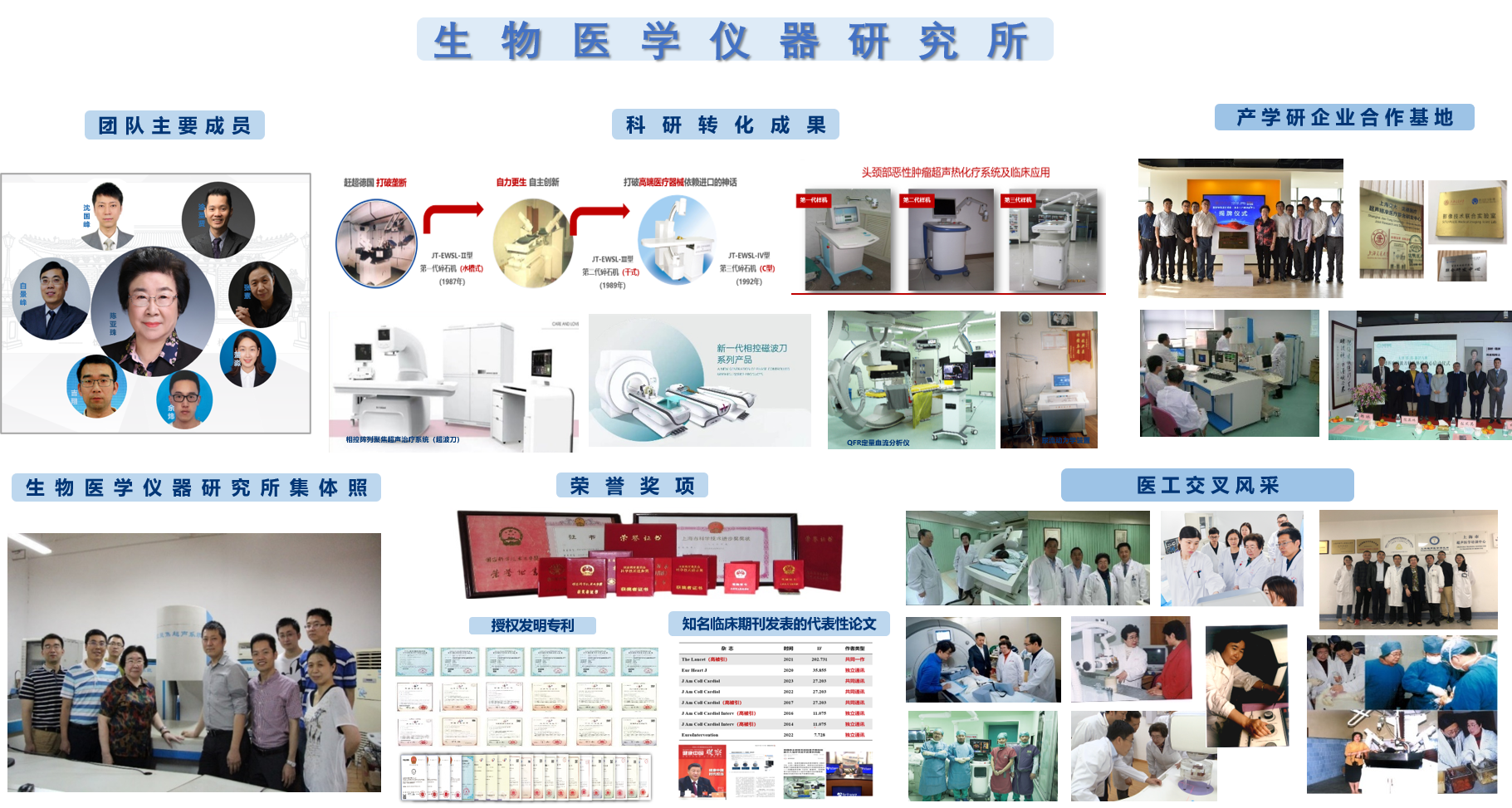 生物医学仪器研究所拥有一支多学科融合,理、工、医相结合的研究队伍。在陈亚珠院士的领导下,以广大医患需求为导向,推广先进物理治疗技术,力争做到技术和治疗以人为本,深入从事物理因子治疗技术研究,瞄准新兴边缘学科,成功研制液电式肾结石体外粉碎机,现尤以超声和电磁波物理因子为主,重点开发进口依赖度高、临床需求迫切的中高端医疗器械,在聚焦超声(磁波刀、超波刀)、射频消融、计算冠脉生理功能学评估(QFR、OFR与UFR)等现代医疗设备的研究中已获得重要的技术积累和初步的临床应用。