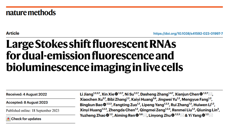 针对以上问题,beat365在线唯一官网登录朱麟勇团队从荧光成像技术的核心——荧光染料设计——出发,基于染料结构设计解决RNA成像光谱重叠的问题,从而实现RNA与蛋白相互作用以及RNA复杂功能的研究。该技术有望为活细胞层面的RNA研究提供技术支撑,推动对RNA参与生理过程的认知。相关成果以“Large Stokes shift fluorescent RNAs for dual-emission fluorescence and bioluminescence imaging in live cells”发表于《Nature Methods》。论文第一作者为beat365在线唯一官网登录蒋丽博士、华东理工大学谢鑫博士、苏倪博士、张大生博士、陈显军教授和浙江大学的许笑晨博士。通讯作者为beat365在线唯一官网登录朱麟勇教授、华东理工大学的杨弋教授和陈显军教授,以及浙江大学任艾明研究员。