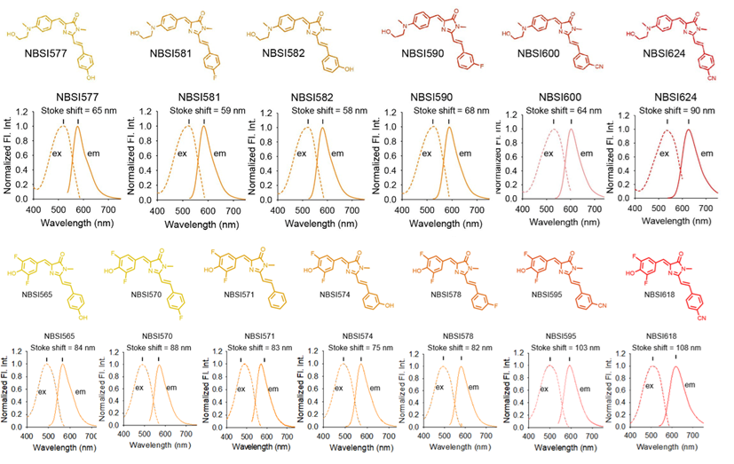 从谱图原理分析,染料分子在基态吸收光子后跃迁到激发态(S1),经过一系列的能量耗散后,再从一个低能激发态(Stran)以荧光发射的方式回到基态。增加染料的激发光谱和发射光谱间距,实质上就是增加S1和Stran之间的能量差,也就是在发射荧光之前,如何通过非辐射的方式尽可能多地消耗激发态能量。通过研究团队发现,增加染料分子结构的转动能力,能够增加分子在激发态的构象数量,进而增加分子激发态的非辐射能量耗散。基于这一发现,团队在原创的分子转子型染料的骨架结构上,引入更多的转动位点,从而使得染料的发射光谱大幅度红移,斯托克斯位移显著增加,最高可达108 nm,高出传统荧光染料至少4倍。