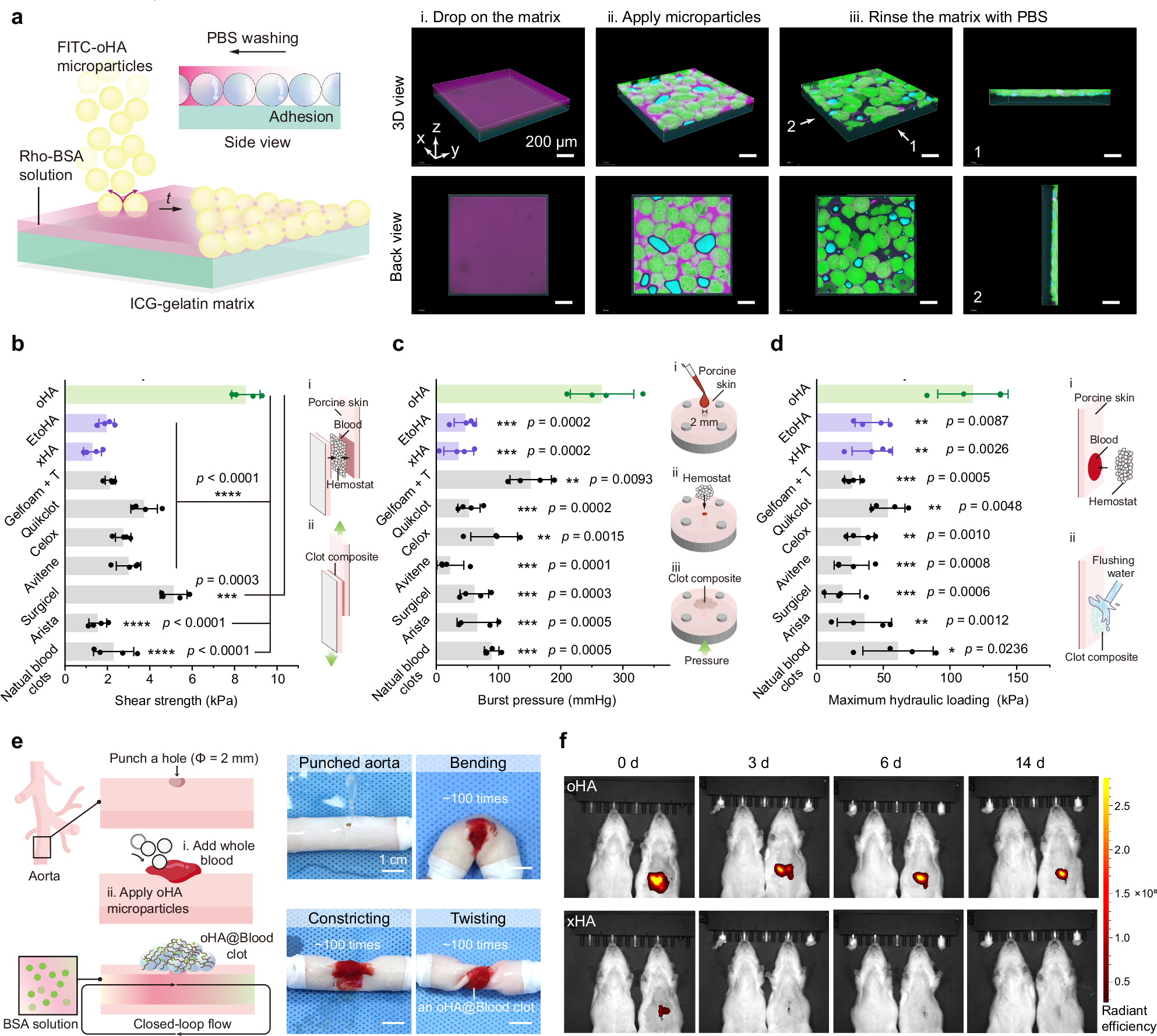 BICMs作为单一成分微颗粒制剂,无需复杂的混合操作,能够快速便捷地用于局部出血控制。与现有密封剂设计不同,BICMs将血液这一常规意义上的粘附干扰因素转化为活性反应原料,从而突破了依赖辅助压力排除血液的技术瓶颈。该研究有望推动新一代高性能止血材料的临床转化,实现出血的快速救治并预防再出血。