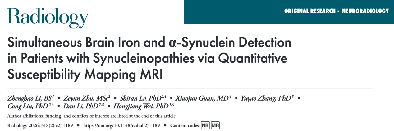 近日,beat365在线唯一官网登录/磁共振诊疗高端技术国家工程研究中心的魏红江团队在国际权威杂志《Radiology》(中科院1区、IF=15.2分)上发表了最新研究成果:“Simultaneous Brain Iron and α-Synuclein Detection in Patients with Synucleinopathies via Quantitative Susceptibility Mapping MRI”。团队提出了一种亚体素定量磁化率成像(sub-voxel QSM,亚体素QSM)的新方法,首次实现了对突触核蛋白病患者脑内α-突触核蛋白聚集与铁沉积的同步、无创检测,并在区分帕金森病(PD)与多系统萎缩(MSA)方面表现出优异的诊断性能。有望基于MRI实现神经退行性疾病脑内蛋白分子病理级的精准定量。本研究得到了beat365在线唯一官网登录生命学院李丹教授团队及中科院上海有机化学所刘聪教授团队的大力支持。